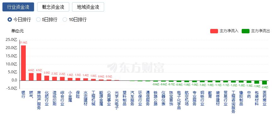 行业资金方面,截至收盘,银行、燃气、房地产服务等净流入排名靠前,其中银行净流入21.61亿。