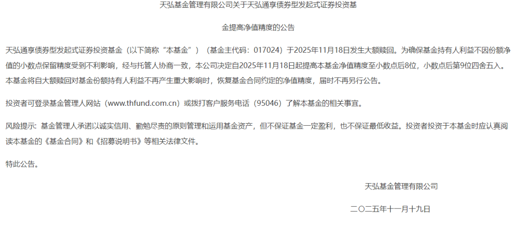 与之形成鲜明对比的是,近日,多只债券基金拉响大额赎回警报。11月19日,天弘基金公告称,天弘通享债券基金于11月18日发生大额赎回,为确保基金持有人利益不因份额净值的小数点保留精度受到不利影响,自11月18日起提高基金净值精度至小数点后8位,小数点后第9位四舍五入。