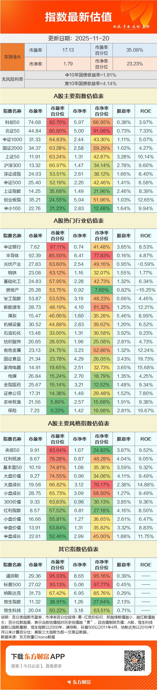 截至11月20日收盘,东方财富Choice数据显示,东财全A市盈率为17.13倍,市盈率百分位为35.08%;市净率为1.79倍,市净率百分位为23.23%。