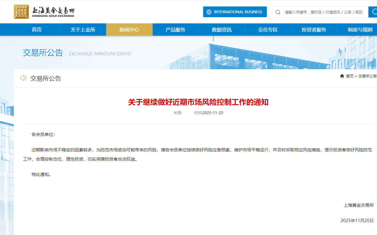 上海黄金交易所:请各会员单位继续做好风险应急预案 维护市场平稳运行