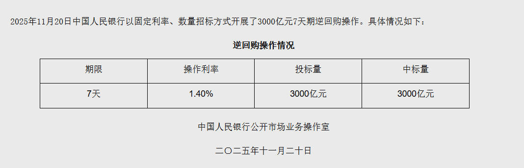 中新网11月20日电据央行网站消息,2025年11月20日中国人民银行以固定利率、数量招标方式开展了3000亿元7天期逆回购操作。具体情况如下: