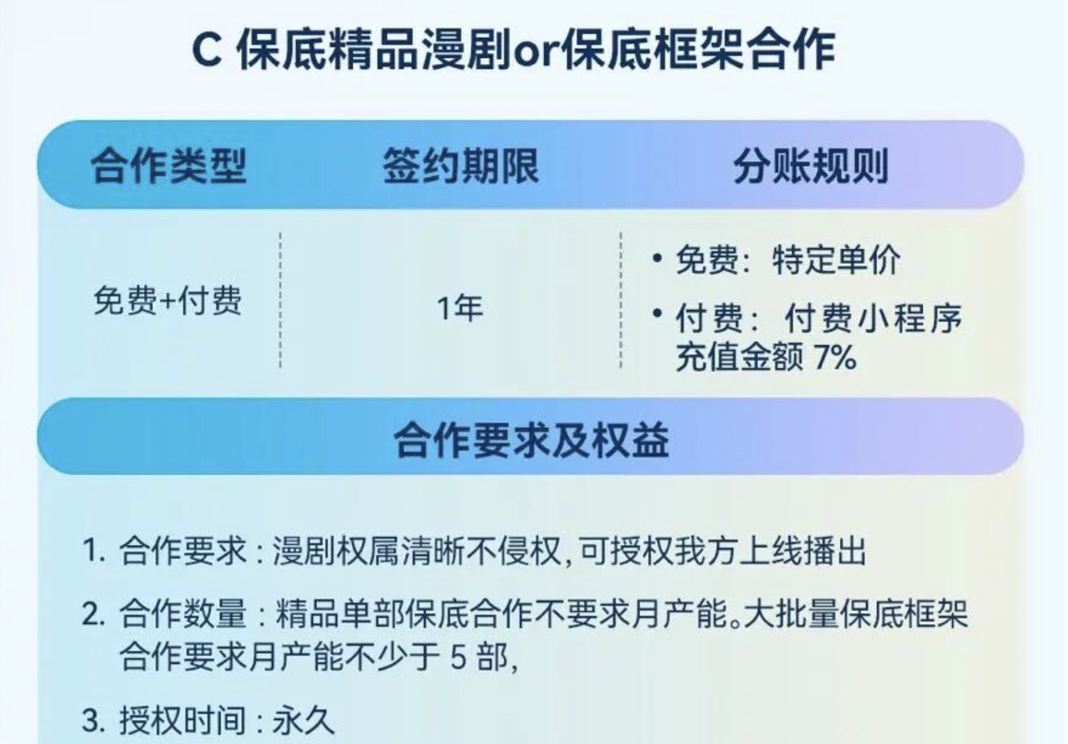 蓝鲸科技记者进入字节跳动官方的漫剧信息发布群发现,今年8月下旬开始,短剧版权中心就开始邀请成品漫剧月产能大于等于5部的机构签订“大批量保底框架合作协议”,有精品漫剧制作能力的机构签订“精品漫剧单部保底合作协议”,同时开放超6万部番茄小说网文原创IP,以供IP授权改编漫剧合作等。上述政策在10月底沉淀成为《成品漫剧合作指引》。