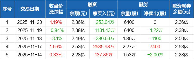 融资方面,当日融资买入2077.68万元,融资偿还2330.72万元,融资净偿还253.04万元,连续3日净偿还累计1765.09万元。融券方面,融券卖出0股,融券偿还0股,融券余量6400股,融券余额3.81万元。融资融券余额合计2.36亿元。