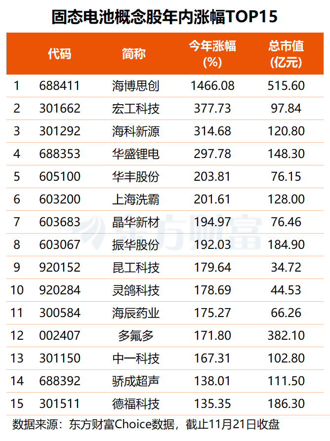 固态电池板块指数今年累计上涨超50%,其中九成概念股股价上行,平均涨幅约56%。其中,海博思创区间涨幅居首,宏工科技、海科新源年内股价涨超3倍,华盛锂电、华丰股份、上海洗霸涨逾2倍,振华股份、多氟多、石大胜华、金银河等23股股价涨幅均在100%至200%之间。