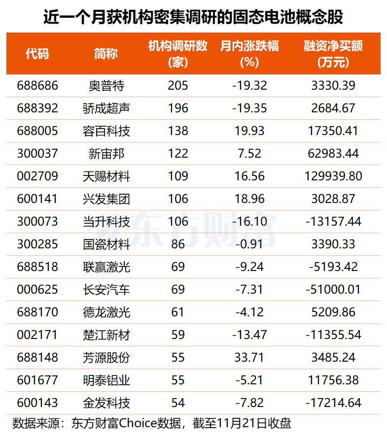 近一个月以来,共有15只固态电池概念股获得超50家机构的密集调研。其中,奥普特、骄成超声均获约200家机构调研,容百科技、新宙邦、天赐材料、兴发集团、当升科技等5股机构调研数均超100家。