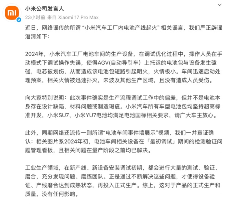 11月23日,“小米公司发言人”账号发文澄清网传所谓“小米汽车工厂内电池产线起火”相关谣言。小米方面介绍,2024年,小米汽车工厂电池车间的生产设备,在调试优化过程中,操作人员在手动模式下调试操作失误,使得AGV(自动导引车)上托运的电池包与设备发生磕碰,电芯被划伤,从而造成该电池包短路引起明火,火情极小。车间迅速启动处理预案,相关火情被迅速扑灭,未波及其他生产区域,且没有造成人员受伤。小米方面强调,此次事件确实是生产流程调试工作中的偏差,并不是电池本身存在设计缺陷、材料问题或制造瑕疵。