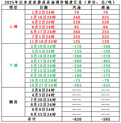 2025年以来,国内成品油零售限价已经历二十二轮调整窗口,分别为“七涨九跌六搁浅”。调价后,国内汽、柴油价格每吨较去年底分别下跌620元、595元。