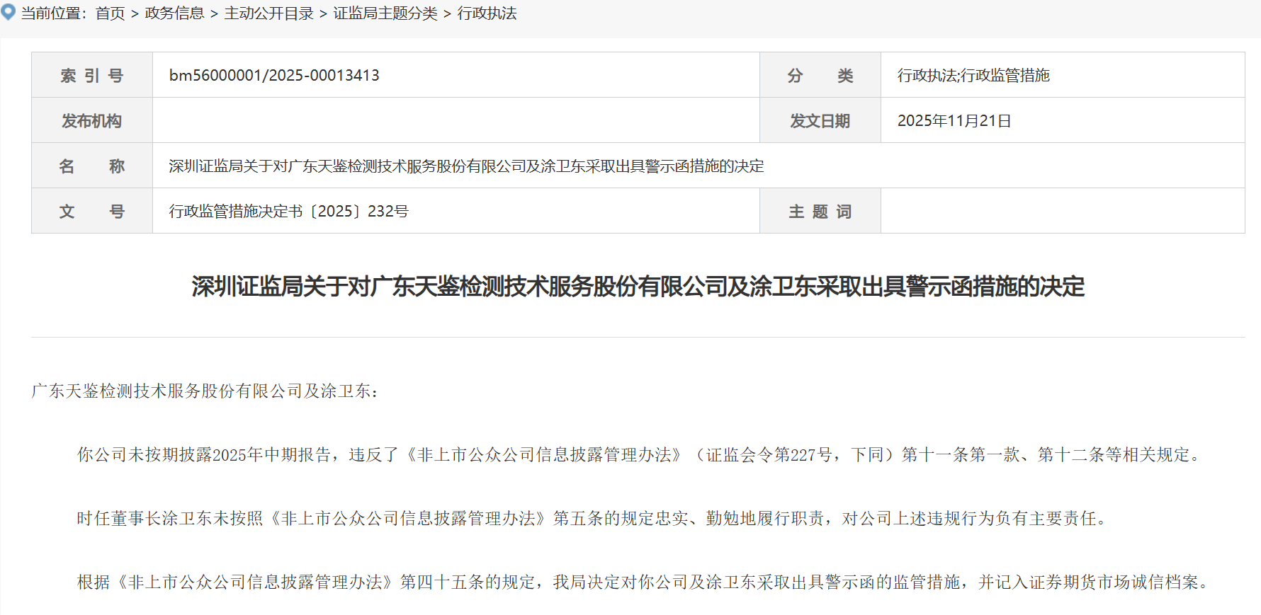 决定称,天鉴检测未按期披露2025年中期报告,违反了《非上市公众公司信息披露管理办法》(证监会令第227号,下同)第十一条第一款、第十二条等相关规定。时任董事长涂卫东未按照《非上市公众公司信息披露管理办法》第五条的规定忠实、勤勉地履行职责,对公司上述违规行为负有主要责任。根据《非上市公众公司信息披露管理办法》第四十五条的规定,深圳证监局决定对天鉴检测及涂卫东采取出具警示函的监管措施,并记入证券期货市场诚信档案。