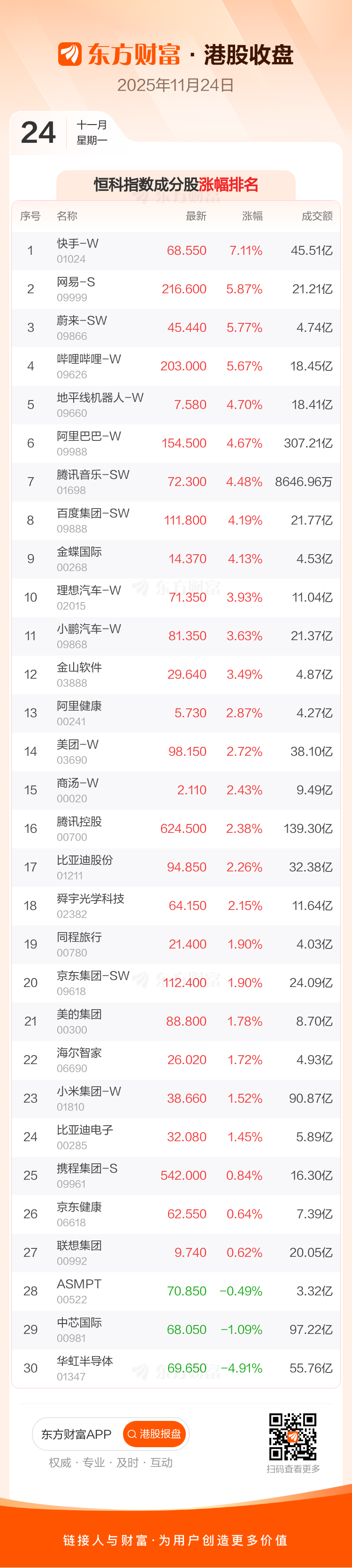 11月24日港股收盘:恒指涨1.97% 科技指数涨2.78%