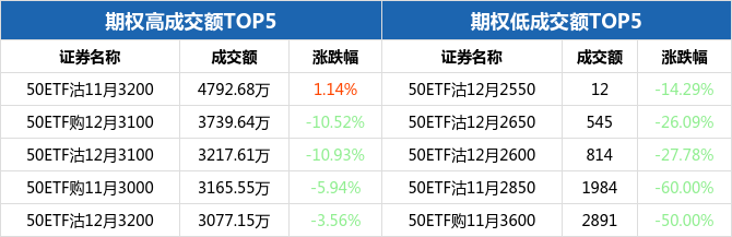 从成交额来看,50ETF期权合约中,50ETF沽11月3200成交额最高,为4792.68万元,全日上涨1.14%,报收0.1068元;而最低的为50ETF沽12月2550,成交额为12元,全日下跌14.29%,报收0.0012元。