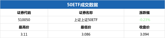 11月24日,上证上证50ETF收报3.094元,下跌0.007点,跌幅0.23%,盘中最高触及3.11元,最低触及3.086元,成交金额19.15亿元。