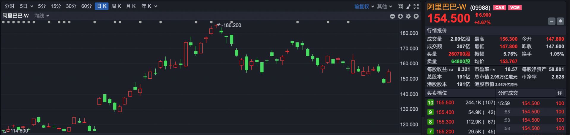 今天,港股市场的最大看点来自阿里巴巴-W(HK09988),在前期累计跌幅近20%之后,阿里今日最大涨幅一度接近6%,最终收涨4.67%。