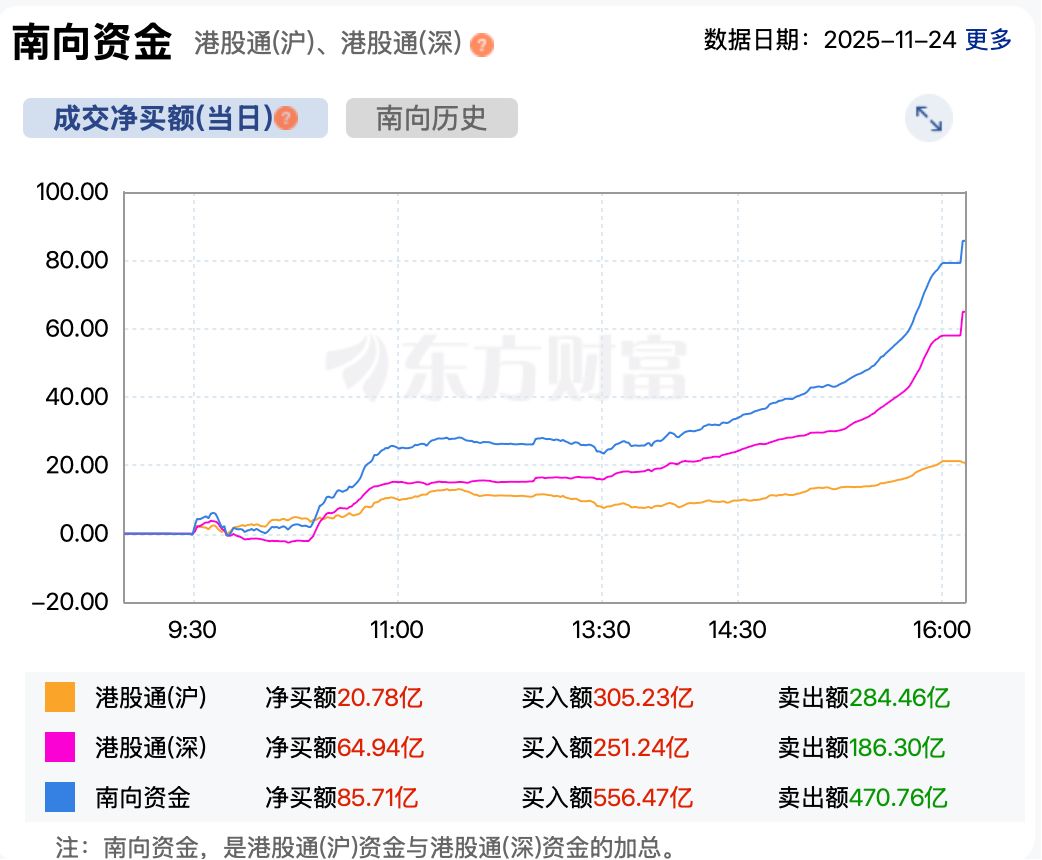 资金方面,截至收盘,南向资金累计净买入港股超85亿港元。