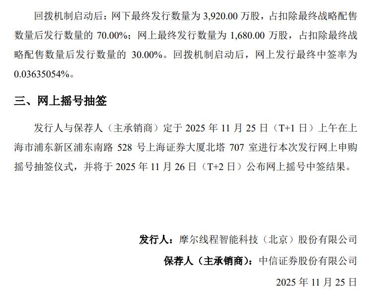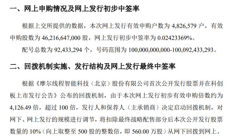 根据《摩尔线程智能科技(北京)股份有限公司首次公开发行股票并在科创板上市发行公告》公布的回拨机制,由于本次网上发行初步有效申购倍数约为4126.49倍,超过100倍,发行人和保荐人(主承销商)决定启动回拨机制,对网下、网上发行的规模进行调节,将扣除最终战略配售部分后本次公开发行股票数量的10%(向上取整至500股的整数倍,即560.00万股)从网下回拨到网上。回拨机制启动后:网下最终发行数量为3920.00万股,占扣除最终战略配售数量后发行数量的70.00%;网上最终发行数量为1680.00万股,占扣除最终战略配售数量后发行数量的30.00%。回拨机制启动后,网上发行最终中签率为0.03635054%。