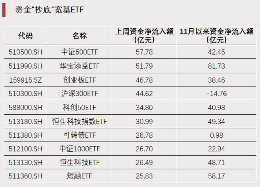 资金流向方面,上周(11月17日至21日)市场大幅调整,但资金呈现“抄底”的态势,中证500、创业板、沪深300等多只宽基ETF获资金大举净流入。11月以来,恒生科技、科创50等相关ETF净流入居前。