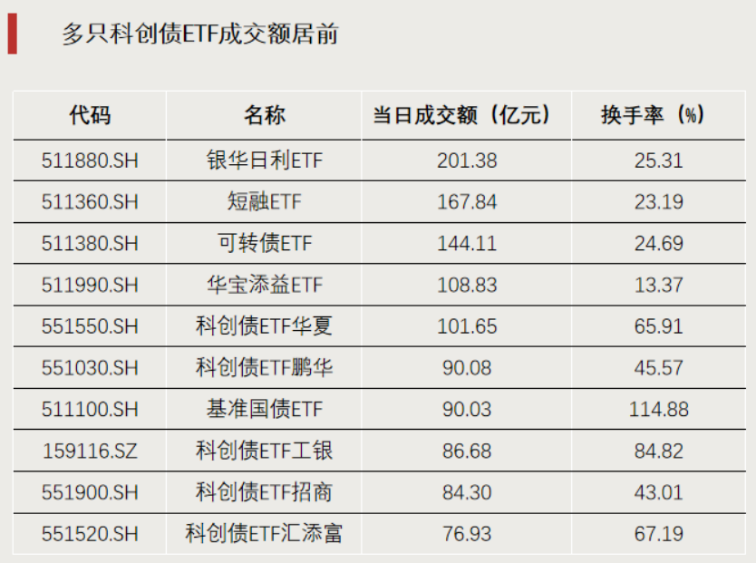 今日,部分货币和债券型ETF交投活跃,银华日利ETF(511880)成交额超200亿元,基准国债ETF(511100)换手率达114.88%,多只科创债ETF成交额居前。