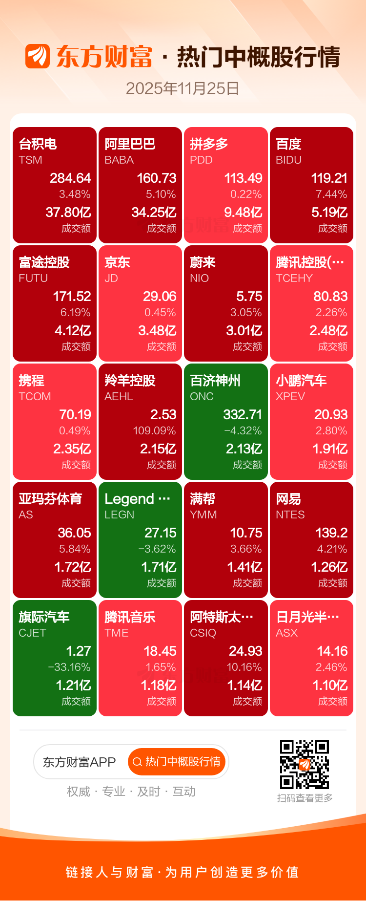 台积电涨3.48%,阿里巴巴涨5.10%,拼多多涨0.22%,百度涨7.44%,富途控股涨6.19%,京东涨0.45%,蔚来涨3.05%,腾讯控股(ADR)涨2.26%,携程涨0.49%,羚羊控股涨109.09%。