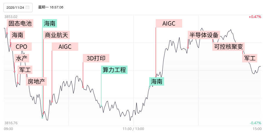 财联社11月25日电,上个交易日市场探底回升,三大指数集体收红。全市场超4200只个股上涨。沪深两市成交额1.73万亿,较上周五缩量2379亿。1)据报道,阿里旗下的AI助手千问App公测一周,下载量已突破1000万次,超越ChatGPT、Sora、DeepSeek成为史上增长最快的AI应用。受此消息提振,港股阿里巴巴股价一度涨近6%,总市值重新逼近3万亿港元。阿里概念全天领涨AI应用端光云科技、新华都、三六零等多股录得涨停,AI营销概念人气龙头蓝色光标一度触及20厘米涨停,易点天下盘中续创历史新高。2)谷歌宣布算力扩容计划,计划未来4-5年内实现算力容量1000倍提升,每6个月翻倍,以支撑AI基础设施竞争。谷歌OCS产业链继续强者恒强,腾景科技、中富电路触及20厘米涨停双双刷新历史新高,特发信息录得2连板。而此前资金深度介入的英伟达链继续展开补跌,工业富联一度触及跌停,近2个交易日累计下跌超15%,而中际旭创盘中一度跌近6%。3)近日,国家国防科技工业局官网发布了《2026年度考试录用公务员公告》,其中包含“商业航天司”航天监管岗等13个职位。商业航天概念全天表现火爆,高位人气股航天发展反包板走出7天6板,斯瑞新材、飞沃科技、上海港湾均创出历史新高。4)广汽集团董事长冯兴亚在2025广州车展上透露,广汽全固态电池中试产线已经建成试产,率先具备了60Ah以上车规级全固态电池批量制造条件。固态电池概念未受到锂矿等方向调整拖累,全天表现可圈可点,广汽集团全天封死一字涨停,利元亨、铜冠铜箔、杰普特、嘉元科技等多股涨超5%。