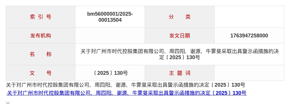 蓝鲸新闻11月24日讯,近日,广东证监局发布了行政监管措施决定书,剑指广州市时代控股集团有限公司、周四阳、谢源、牛霁旻。