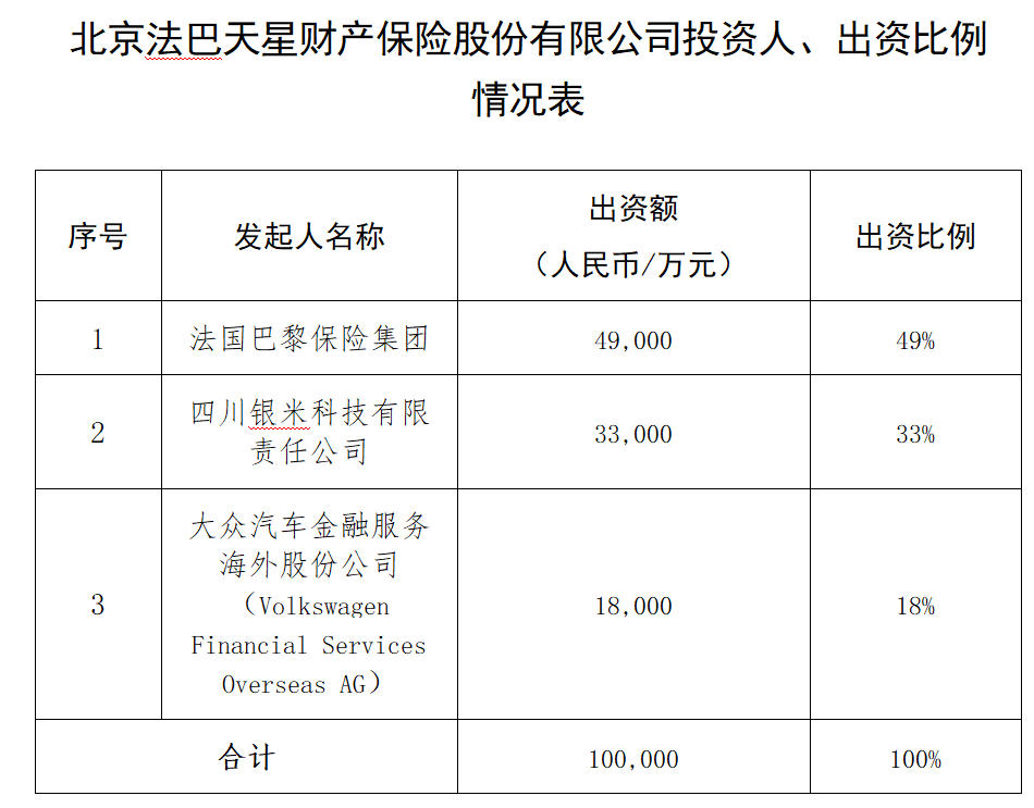 法巴天星保险注册资本为10亿元人民币,股权结构颇为独特,有国际保险巨头、有科技平台公司、有汽车金融公司的综合背景,股东分别为法国巴黎保险集团(下称“法巴保险集团”)、四川银米科技有限责任公司(下称“四川银米科技”)、大众汽车金融服务海外股份公司(下称“大众汽车金服”),各持股49%、33%、18%。