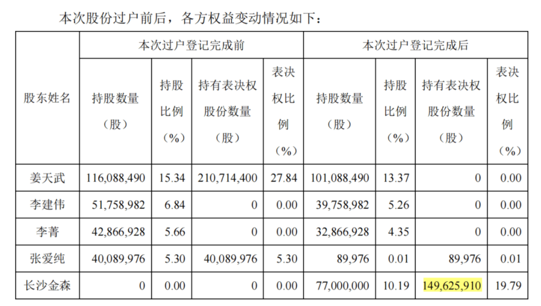 姜天武、李建伟、李菁、张爱纯分别将持有的梦洁股份1500万股、1200万股、1000万股、4000万股股份,合计7700万股股份转让给长沙金森,每股作价5元,交易金额合计3.85亿元。转让完成后,长沙金森持有梦洁股份7700万股股份,占公司总股本的10%左右。