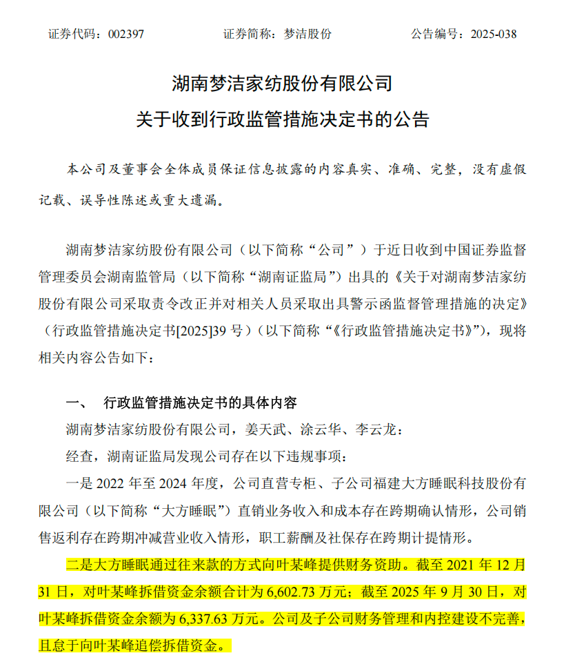 今年10月20日晚间,梦洁股份发布公告称,公司于近日收到监管部门出具的《关于对梦洁股份采取责令改正并对相关人员采取出具警示函监督管理措施的决定》。