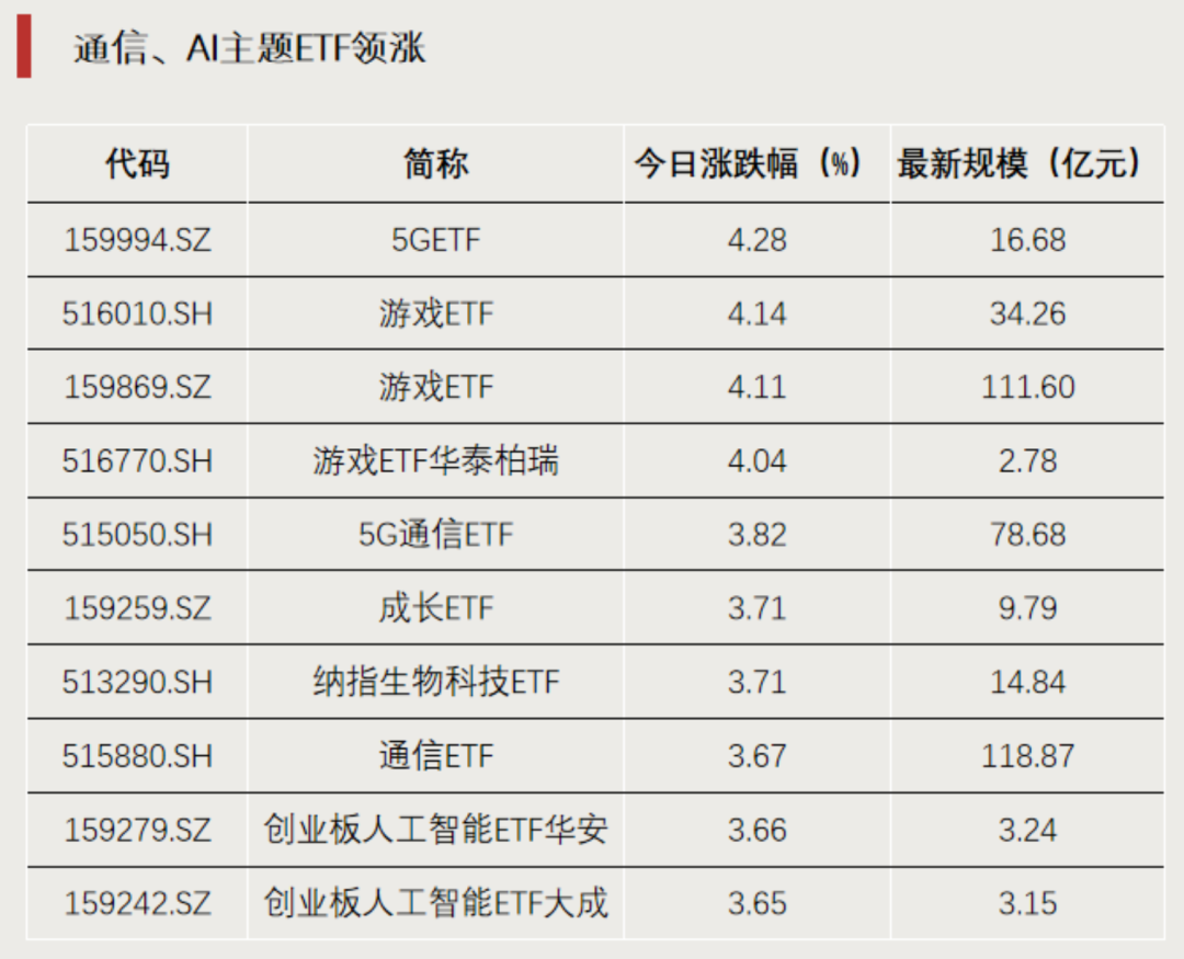 5GETF(159994)以及多只游戏主题ETF今日涨超4%,另有多只通信、动漫游戏、人工智能等主题ETF涨超3%。整体来看,超千只ETF收涨。