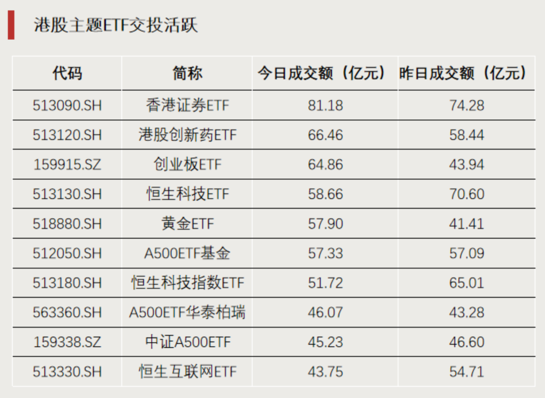 在今日A股以及港股市场的活跃行情下,香港证券ETF(513090)、港股创新药ETF(513120)等热门港股标的成交额靠前,且均较上一交易日放量。此外,创业板ETF(159915)今日上涨1.82%,成交额突破64亿元,较上一交易日增加超20亿元。