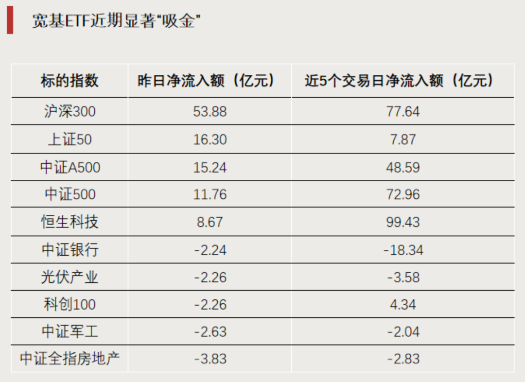 在近期A股宽幅震荡行情下,宽基ETF成为资金的“避风港”。 11月24日,跟踪沪深300的ETF净流入超53亿元,跟踪上证50、中证A500、中证500等指数的ETF均净流入超10亿元。