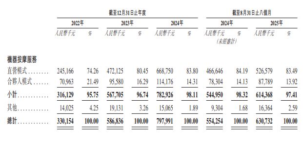 还有约14%的收入来自合伙人模式。在该模式下,城市合伙人负责服务网点运营及按摩设备的维护和清洁,有效解决了下沉市场扩张的资金与效率问题:合伙人负责场地拓展和运营,乐摩科技提供技术支持、系统运维和品牌赋能,双方按约定比例分成。这种轻资产模式让公司得以快速打开市场。