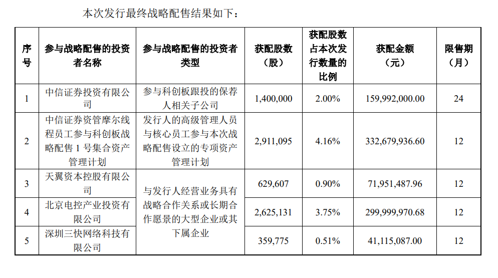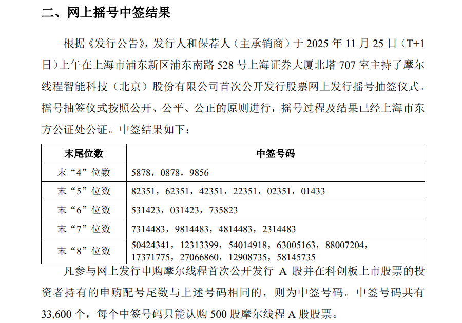 11月25日,摩尔线程发布首次公开发行股票并在科创板上市网下初步配售结果及网上中签结果公告。本次发行价格为人民币114.28元/股。发行人于2025年11月24日(T日)通过上交所交易系统网上定价初始发行“摩尔线程”A股1,120.00万股。凡参与网上发行申购摩尔线程首次公开发行A股并在科创板上市股票的投资者持有的申购配号尾数与上述号码相同的,则为中签号码。中签号码共有33,600个,每个中签号码只能认购500股摩尔线程A股股票。