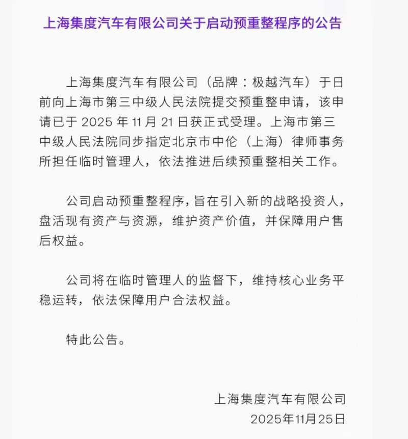 新京报贝壳财经讯(记者白昊天)11月25日,极越汽车通过官微发布公告,宣布上海集度汽车有限公司》(品牌:极越汽车)启动预重整程序,旨在引入新的战略投资人,盘活现有资产与资源,维护资产价值,并保障用户售后权益。