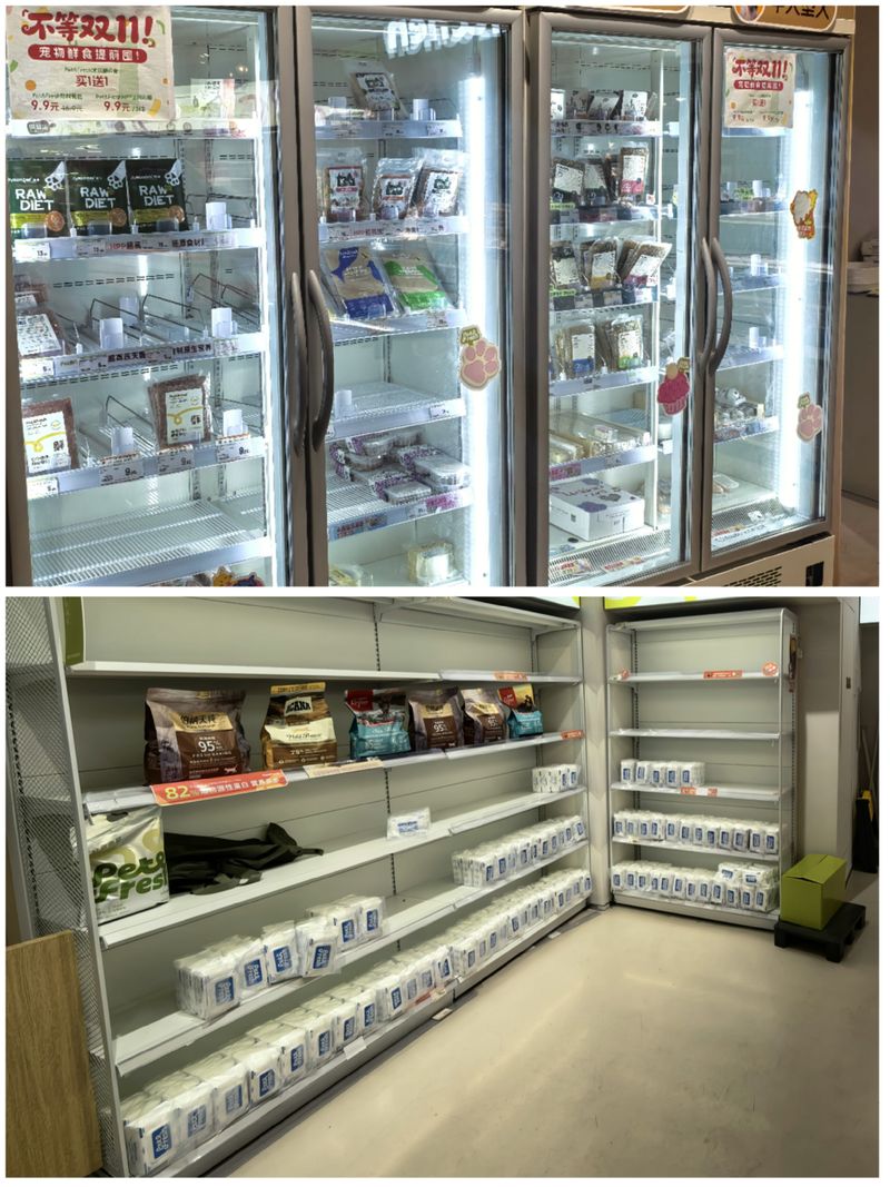 11月25日,派特鲜生首店上海海粟文化广场店店内常温宠物食品货架已基本清空。新京报贝壳财经记者俞金旻摄