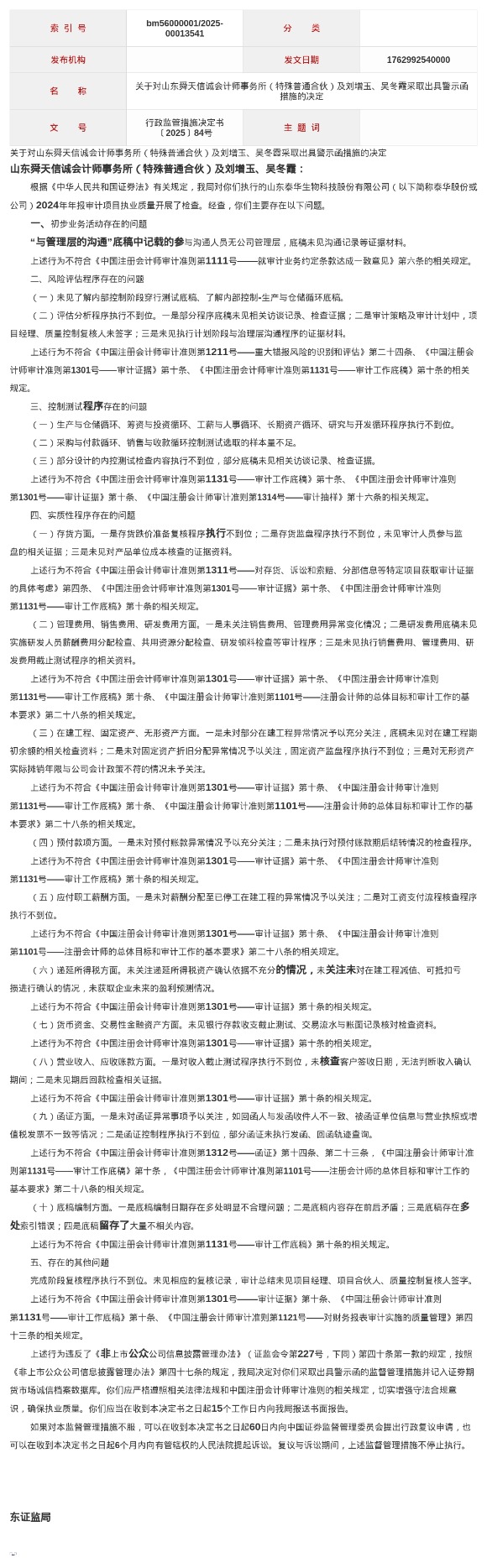 针对以上问题,山东证监局决定对山东舜天信诚会计师事务所(特殊普通合伙)及刘增玉、吴冬霞采取出具警示函的监督管理措施,并记入证券期货市场诚信档案数据库。