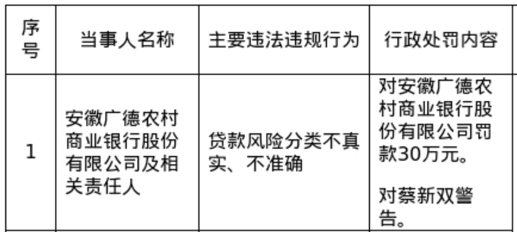 安徽广德农商行被罚30万,涉贷款风险分类不真实等