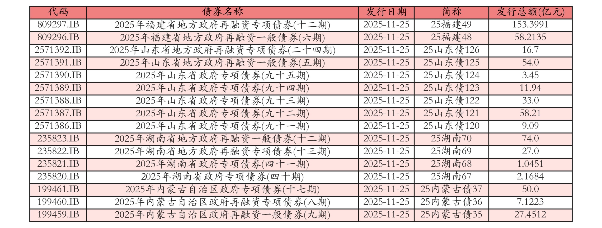 南财智讯11月25日电,南财金融终端数据显示,2025年11月25日全国共发行16只地方政府债,共计586.7896亿元。其中,政府一般专项债发行4只,共213.6647亿元;地方政府专项债发行12只,共373.1249亿元。各地方政府所发行债券中,25内蒙古债37、25山东债121、25湖南70、25福建49发行规模靠前,发行金额分别为50.0亿元、58.21亿元、74.0亿元、153.3991亿元。投标方面,各地方政府所发行债券中,25内蒙古债37、25山东债121、25湖南70、25福建49全场中标倍数靠前。其中:25内蒙古债37全场中标倍数为23.21,全场中标利率为2.34%,边际倍数为1.13;25山东债121全场中标倍数为19.39,全场中标利率为2.39%,边际倍数为25.11;25湖南70全场中标倍数为24.61,全场中标利率为1.97%,边际倍数为1.24;25福建49全场中标倍数为25.24,全场中标利率为1.81%,边际倍数为1.13。今日发行地方政府债详情如下表:
