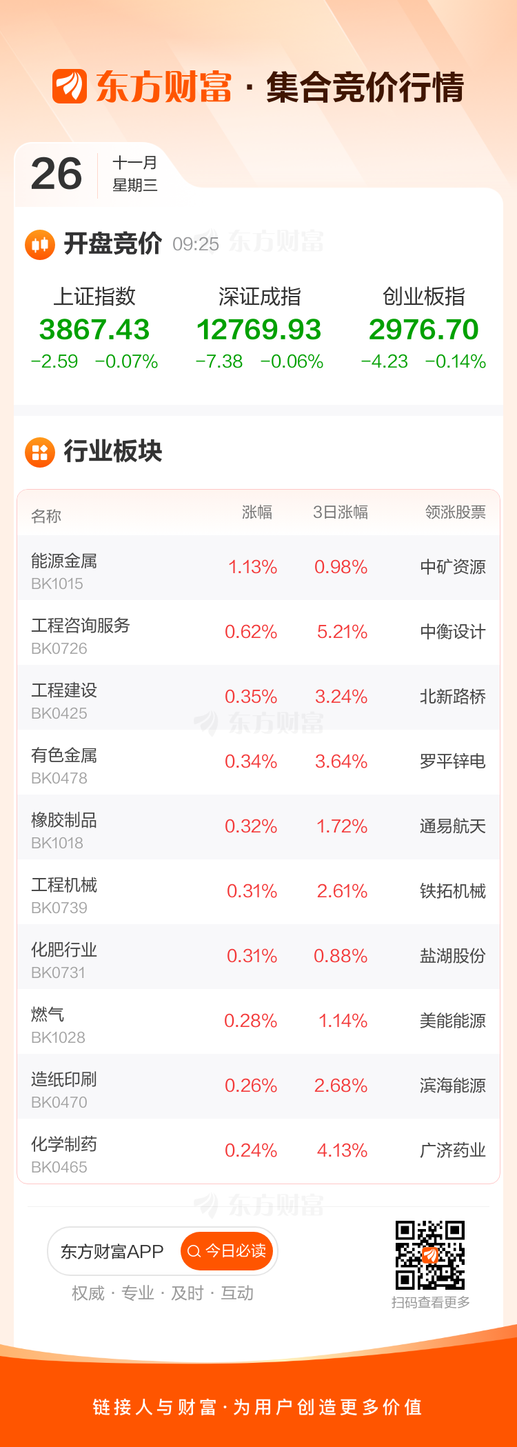 11月26日,三大指数集体低开,上证指数低开0.07%,深证成指低开0.06%,创业板指低开0.14%。板块方面,能源金属领涨,中矿资源涨2.58%,工程咨询服务、工程建设等开盘涨幅居前。