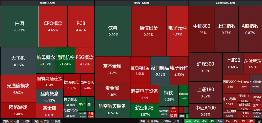 昨日三大指数集体走强,沪指涨0.87%,深证成指涨1.53%,创业板指涨1.77%。沪深两市成交额超过1.8万亿。行业板块呈现普涨态势,教育、游戏、贵金属、能源金属、通信设备、电池、化学制药、光学光电子、保险、消费电子板块涨幅居前,船舶制造板块逆市大跌。