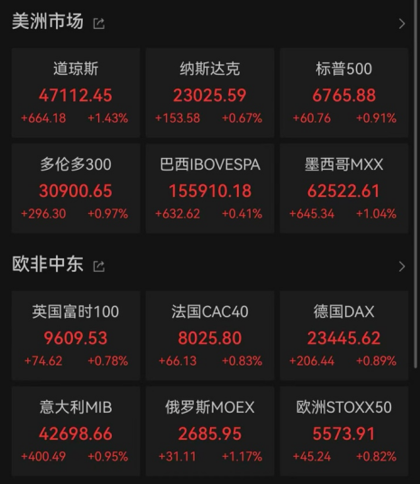 当地时间周二,美三大股指全线收涨,为连续第三个交易日集体上涨。其中,道指涨1.43%报47112.45点,标普500指数涨0.91%报6765.88点,纳指涨0.67%报23025.59点。