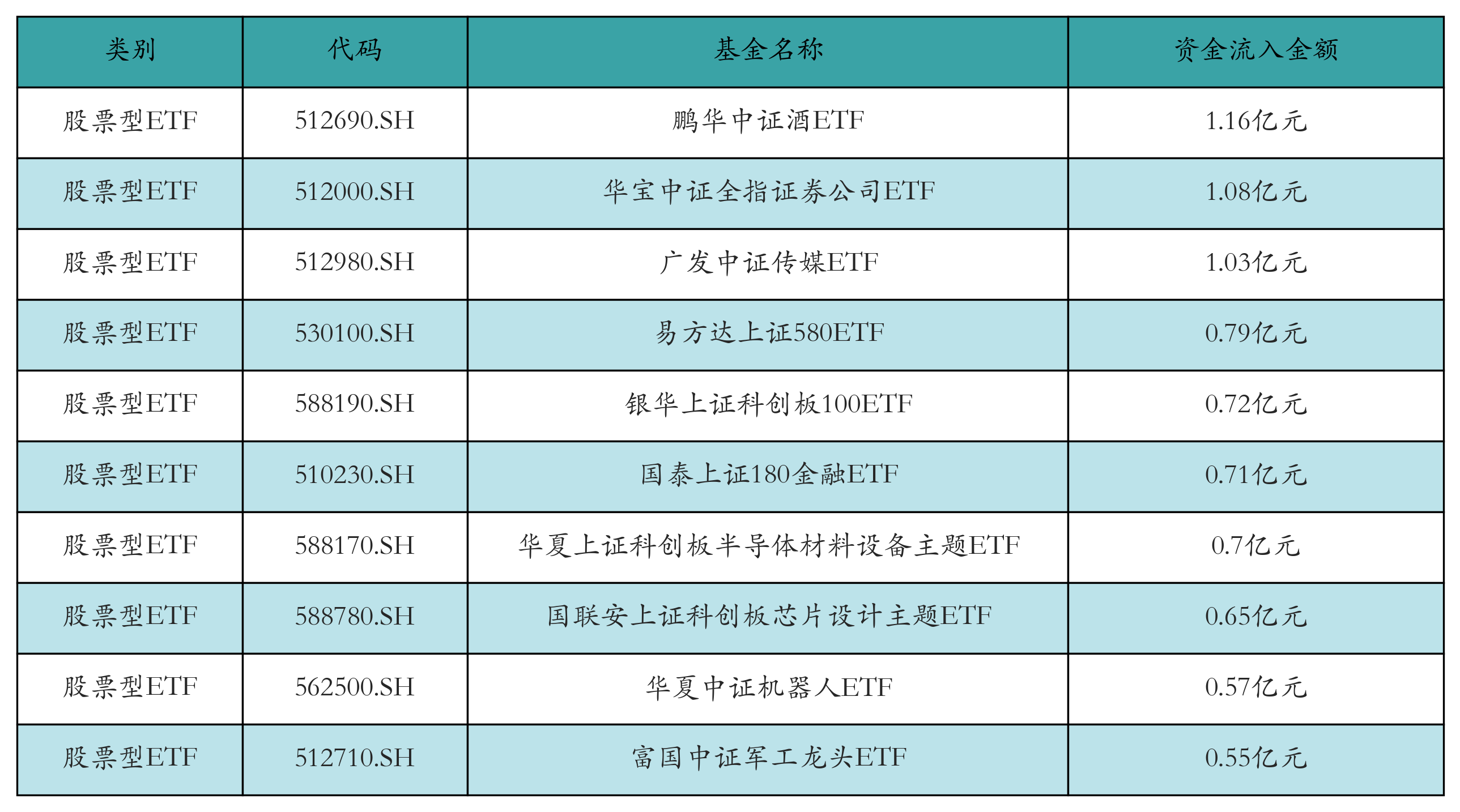 昨日股票型ETF资金流入最多的3只ETF及其流入金额分别为:鹏华中证酒ETF(流入1.16亿元)、华宝中证全指证券公司ETF(流入1.08亿元)、广发中证传媒ETF(流入1.03亿元)。资金流入前10详情见下表: