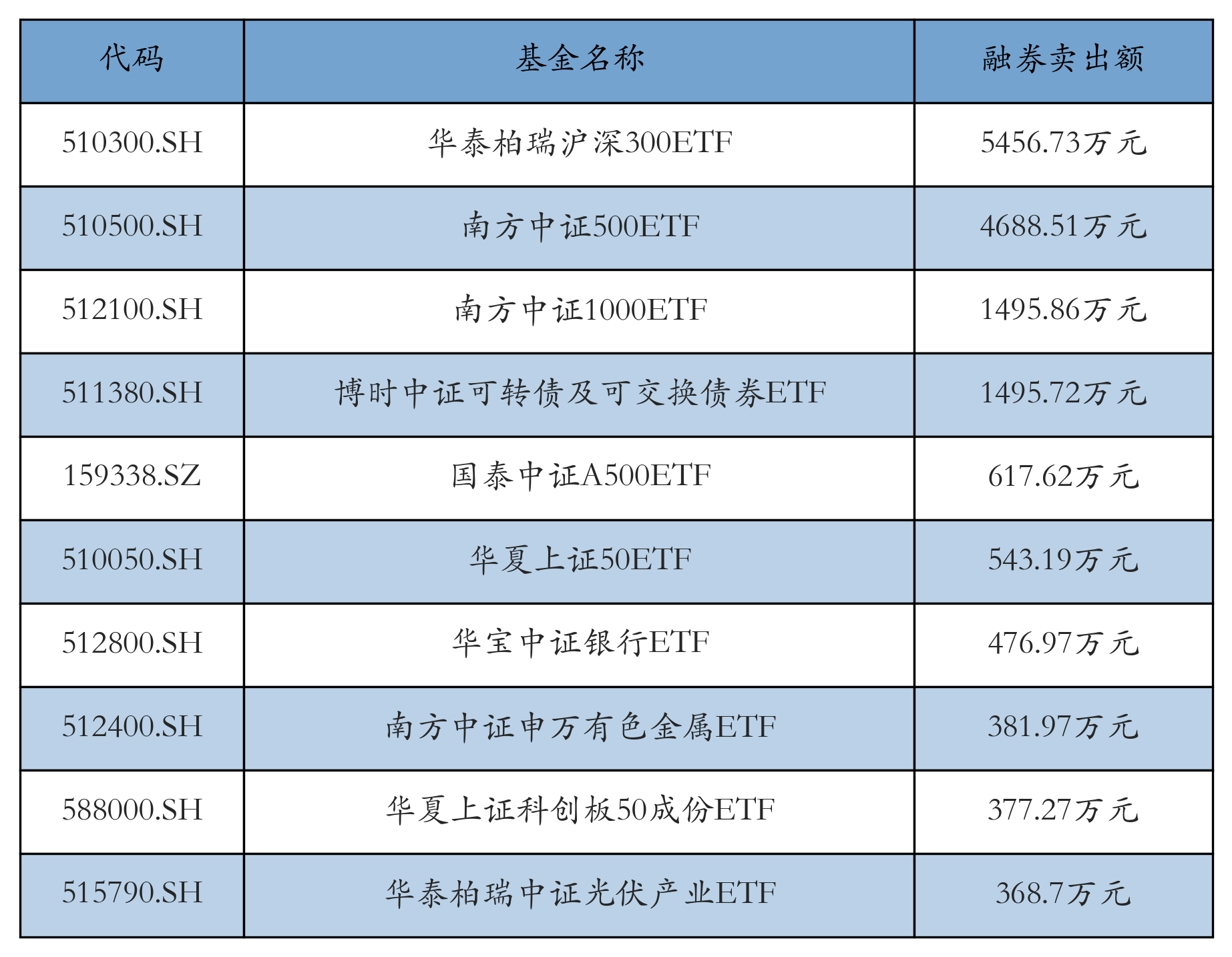 11月25日ETF融券卖出额前三位分别为:华泰柏瑞沪深300ETF(5456.73万元)、南方中证500ETF(4688.51万元)和南方中证1000ETF(1495.86万元),前10具体见下表: