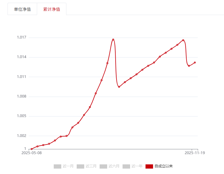 从累计净值表现来看,“鑫悦私银尊享中证1000鲨鱼鳍策略固收封闭(25G6075B)”自成立以来共出现两次较明显的净值回撤。第一次发生在2025年8月13日至8月20日,累计净值从1.0167回落至1.0095,单周跌幅达0.70%;第二次发生在11月5日至11月12日,累计净值由1.0166降至1.0127,随后于11月19日回升至1.0132,呈现企稳修复态势。