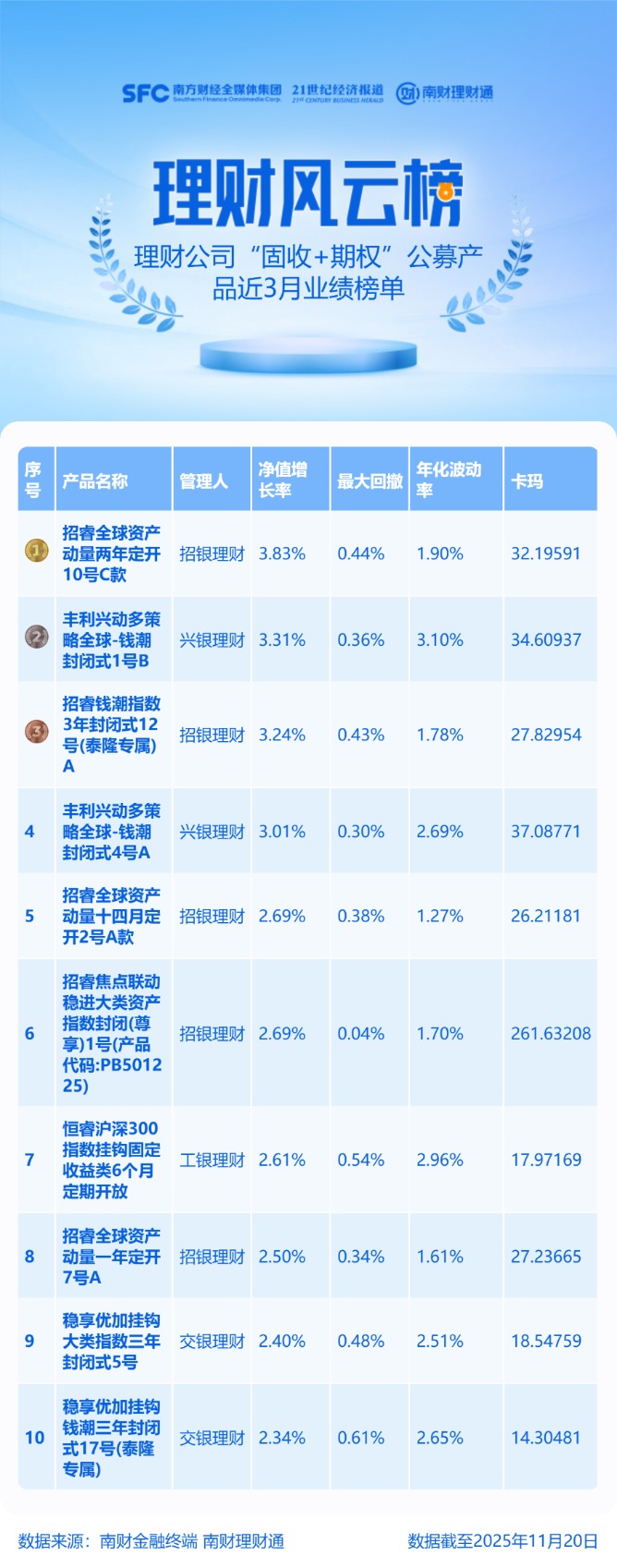 产品统计范围为理财公司发行的公募“固收+期权”理财产品,统计截止日期为2025年11月20日,统计区间为近3个月。