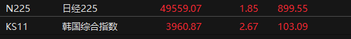 上证报中国证券网讯 11月26日,日韩股市收盘齐涨。日经225指数收涨1.85%,报49559.07点;韩国综合指数收涨2.67%,报3960.87点。