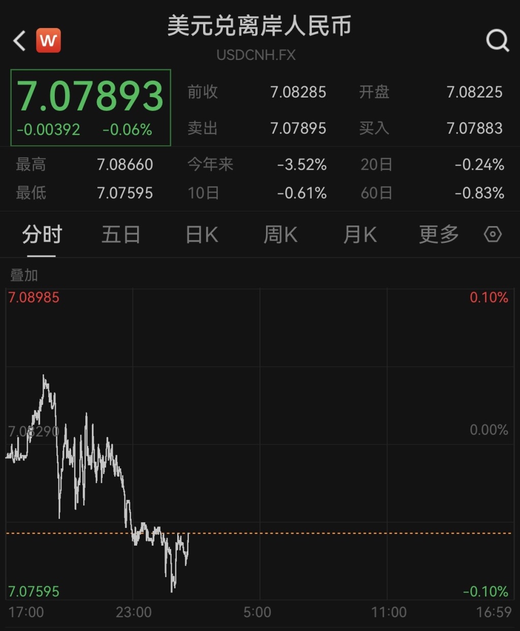 11月26日,人民币对美元即期汇率盘中升破7.08关口,最高至7.0788,创下2024年10月中旬以来的盘中新高。