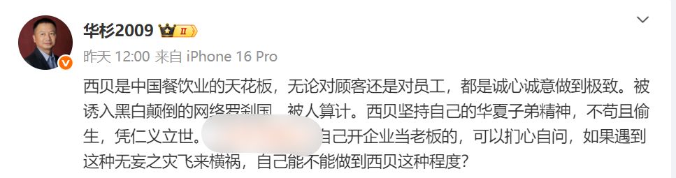 昨日,西贝品牌顾问、华与华创始人华杉发文称,“西贝是中国餐饮业的天花板,无论对顾客还是对员工,都是诚心诚意做到极致。被诱入黑白颠倒的网络罗刹国,被人算计。西贝坚持自己的华夏子弟精神,不苟且偷生,凭仁义立世。”