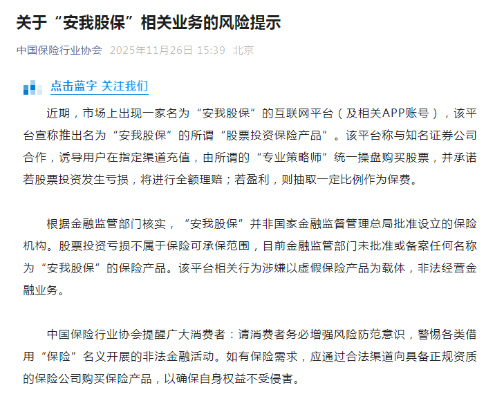 11月26日,中国保险行业协会发布风险提示称,根据金融监管部门核实,“安我股保”并非国家金融监督管理总局批准设立的保险机构。股票投资亏损不属于保险可承保范围,目前金融监管部门未批准或备案任何名称为“安我股保”的保险产品。该平台相关行为涉嫌以虚假保险产品为载体,非法经营金融业务。