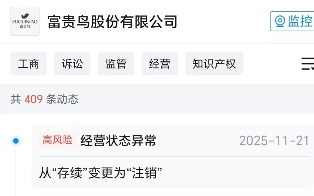 回应称:“富贵鸟”系列品牌商标及相关知识产权,已于2019年通过合法、公开的司法拍卖程序,由我方母公司盛悦晟(厦门)资产管理有限公司成功竞得并完成权利转移。自此,“富贵鸟”品牌已由全新的运营主体承接,并持续开展设计、生产与销售等全部经营活动。目前公司业务健康、运营正常,线上线下销售渠道畅通,持续为市场与消费者提供优质的产品与服务。