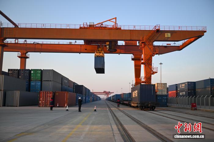 11月25日,编组为55辆的X8059次列车在中欧班列(沈阳)集结中心装货。中新社记者于海洋摄