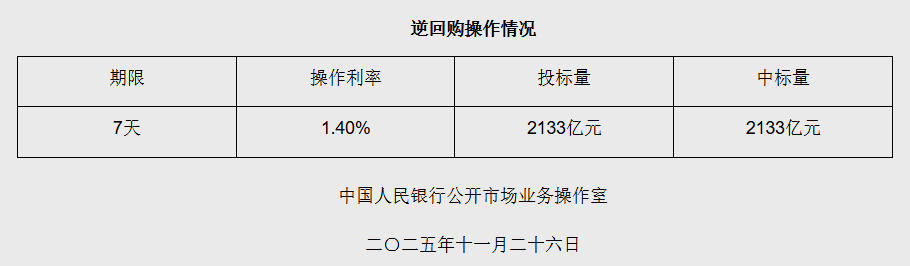中新网11月26日电据央行网站消息,2025年11月26日中国人民银行以固定利率、数量招标方式开展了2133亿元7天期逆回购操作。具体情况如下: